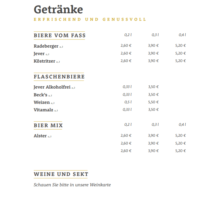 Unsere gutbürgerliche, deutsche Küche bietet Ihnen nicht nur leckere Schnitzel vom „Schnitzelkönig“, sondern auch Steak, Schweinefilet, bis hin zu frischem Fisch wie Scholle, Rotbarsch und Limandesfilet.